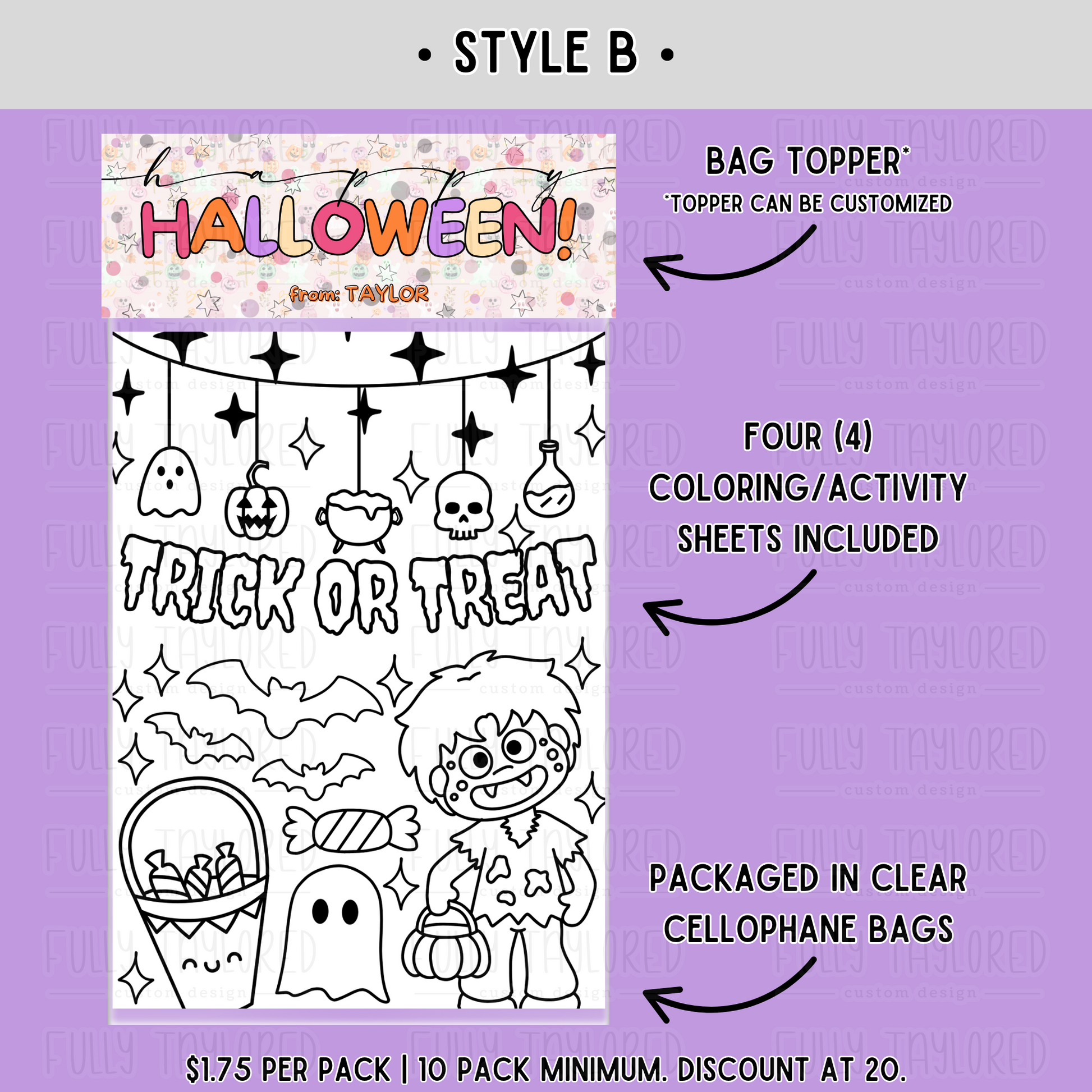 Style B: $1.75 per pack. Bag topper and four (4) coloring and/or activity sheets. Crayons not included.
